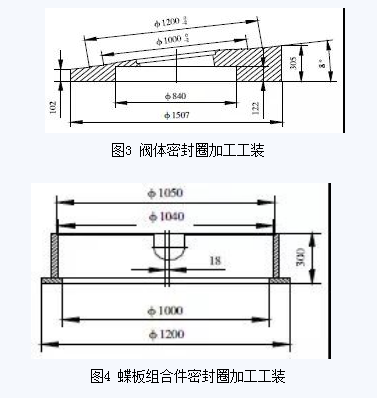 從三偏心金屬硬密封蝶閥的結(jié)構(gòu)特點分析,蝶板組合件密封圈為不銹鋼板與石棉板的組合件,閥體密封圈為硬質(zhì)合金,硬度很高,進刀量很難控制,不易一次加工成型,而且加工面的粗糙度要求很高。為保證加工要求,工藝過程為閥體或蝶板組合件粗加工—閥體密封圈堆焊硬質(zhì)合金—保溫12h—熱處理消除熱應(yīng)力—上工裝粗車密封面—上工裝精車密封面—上磨頭磨削密封面—閥體與蝶板組合件合鏜軸孔—強度試驗—密封試驗。