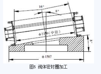 閥體起密封作為的為密封圈,焊接在閥體內(nèi)(圖5)。在2.5m立車上將組焊好的閥體裝夾在閥體密封圈加工工裝上,將立車刀桿旋轉(zhuǎn)8°,根據(jù)圖紙設(shè)計要求,找正后沿圓錐母線方向走刀,車至未焊不銹鋼前的尺寸。然后堆焊不銹鋼,最后將焊好不銹鋼的閥體重新上立車,按上述方法車閥體密封圈至圖紙要求尺寸。最后在立車刀架上裝磨頭,對閥體密封圈進行磨削處理,使其達到圖紙設(shè)計粗糙度要求。